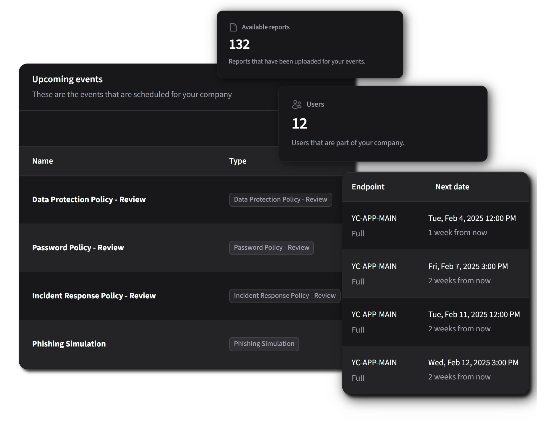 Strategic dashboard centralizing all security metrics and activities. Clear tracking of tasks, findings, and remediation progress.
